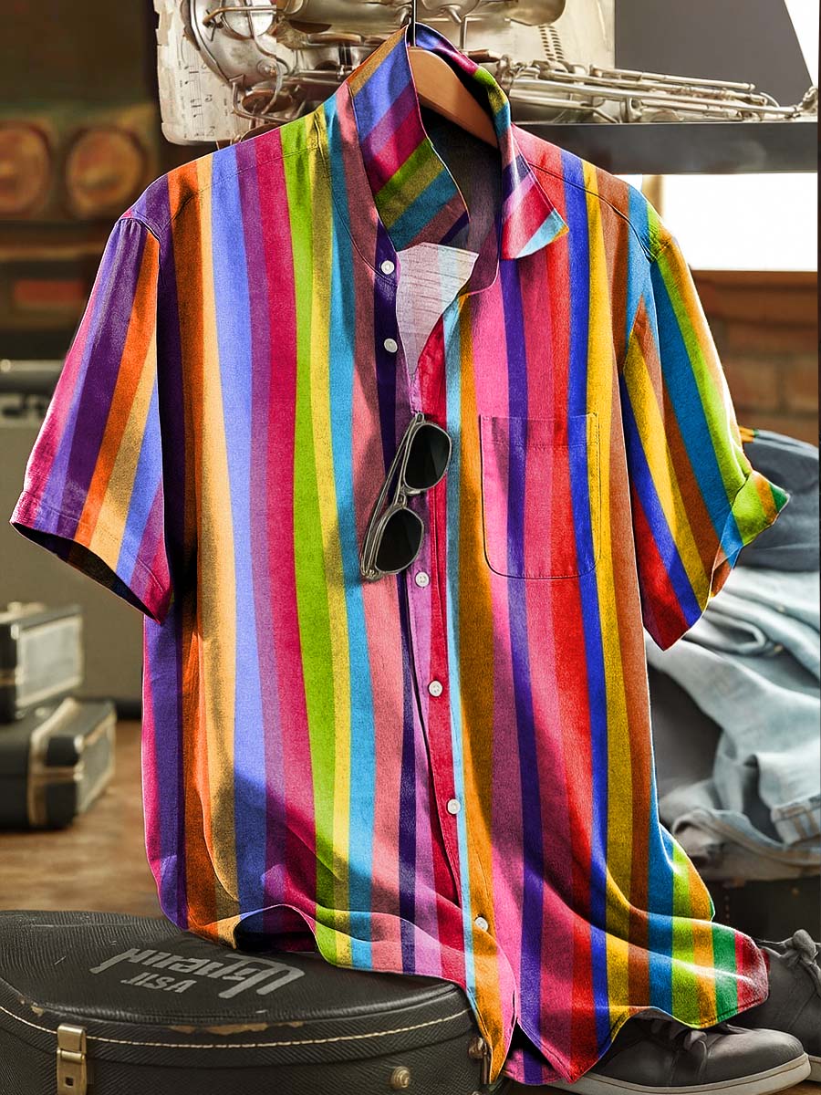Vintage Rainbow Color Stripes Print Casual 100% Cotton Shirt
