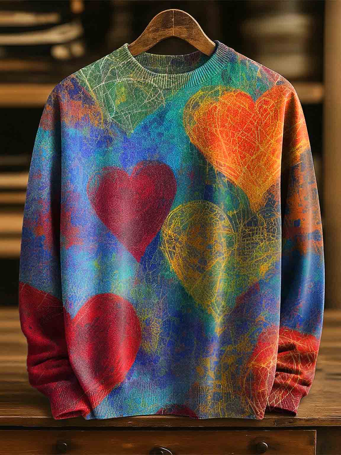 Retro Colorful Heart Art Print Knit Pullover Sweater
