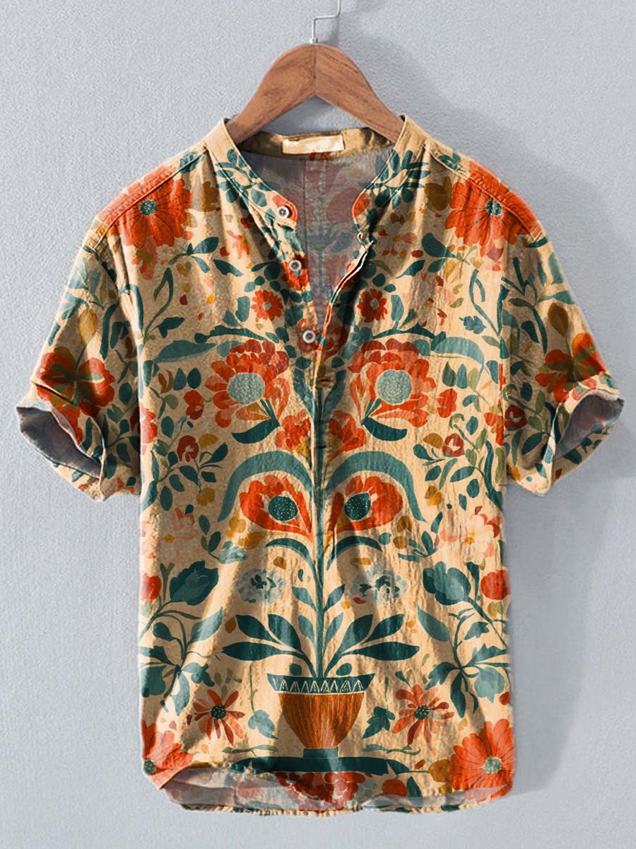 Vintage Indian Art Floral Symmetry Print Casual Cotton And Linen Polo