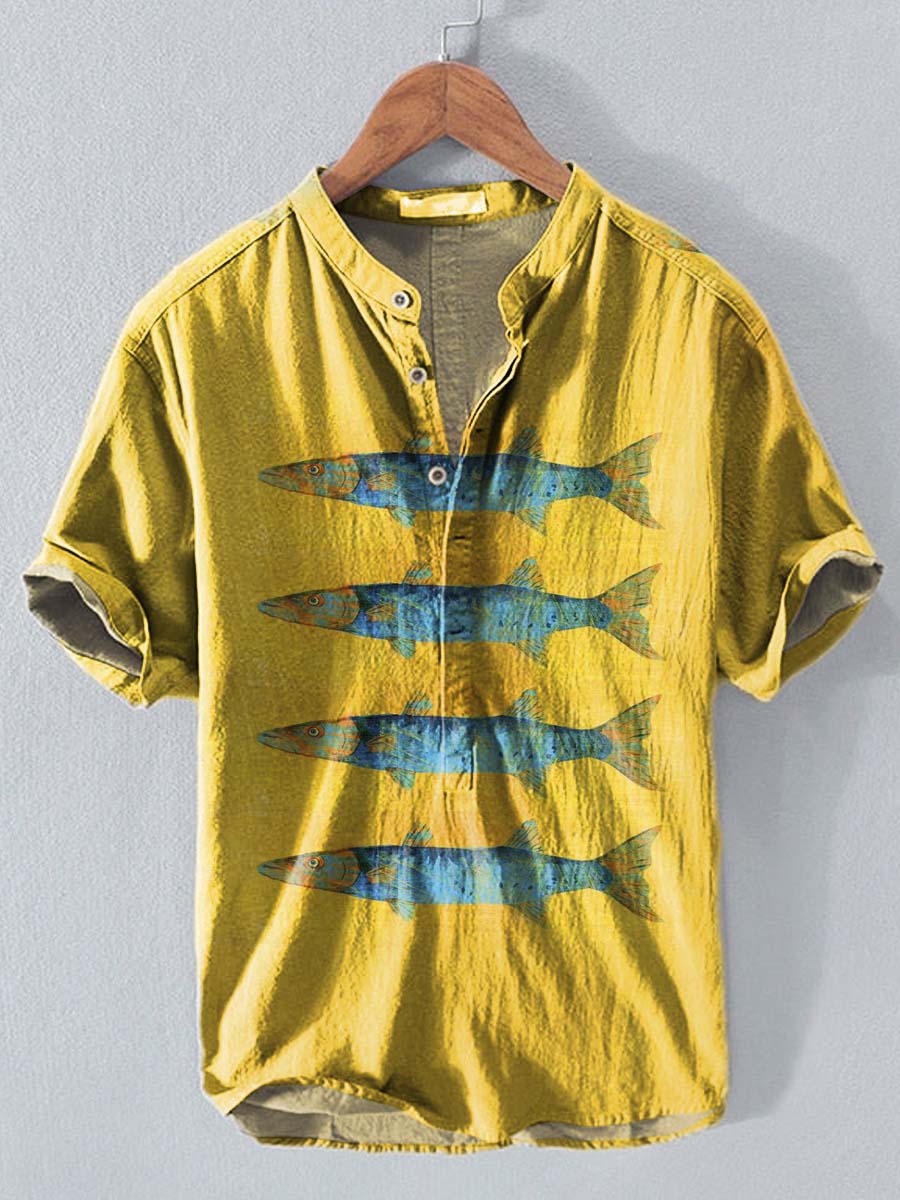 Yellow Sardines Art Casual Cotton And Linen Polo