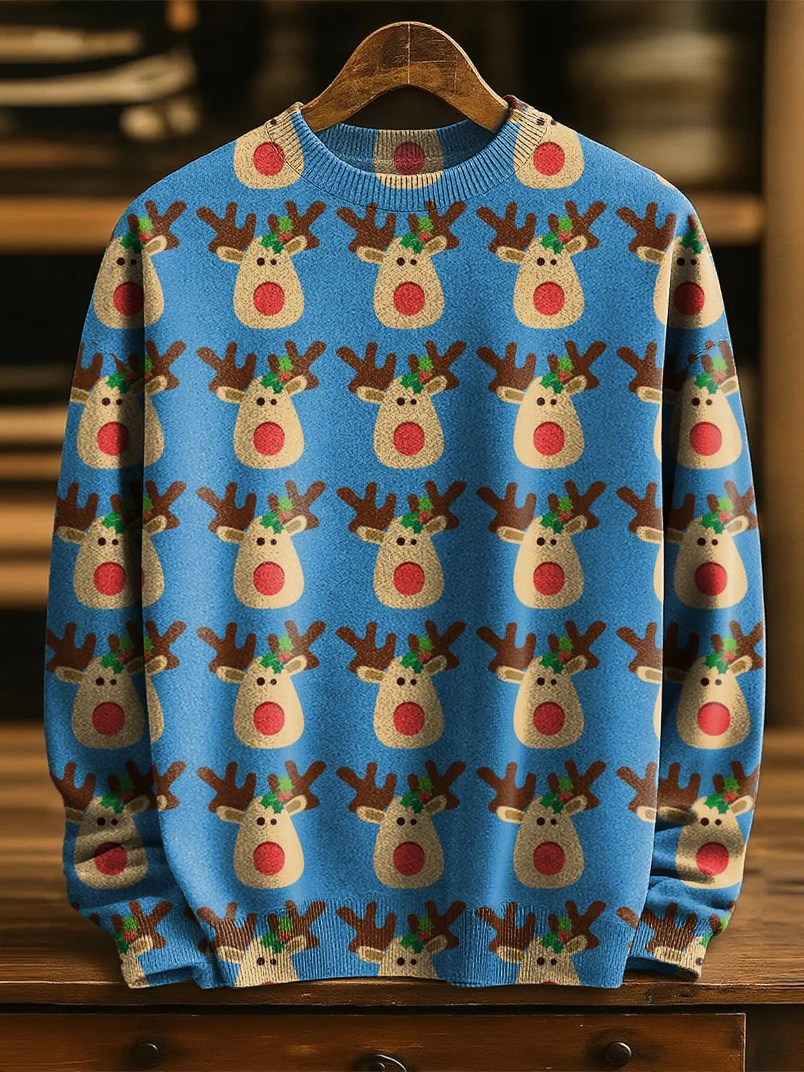 Blue Christmas Reindeer Print Knit Pullover Sweater