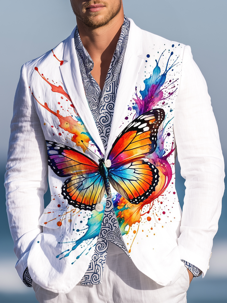 Casual Butterfly Print Linen Single-Breasted Blazer