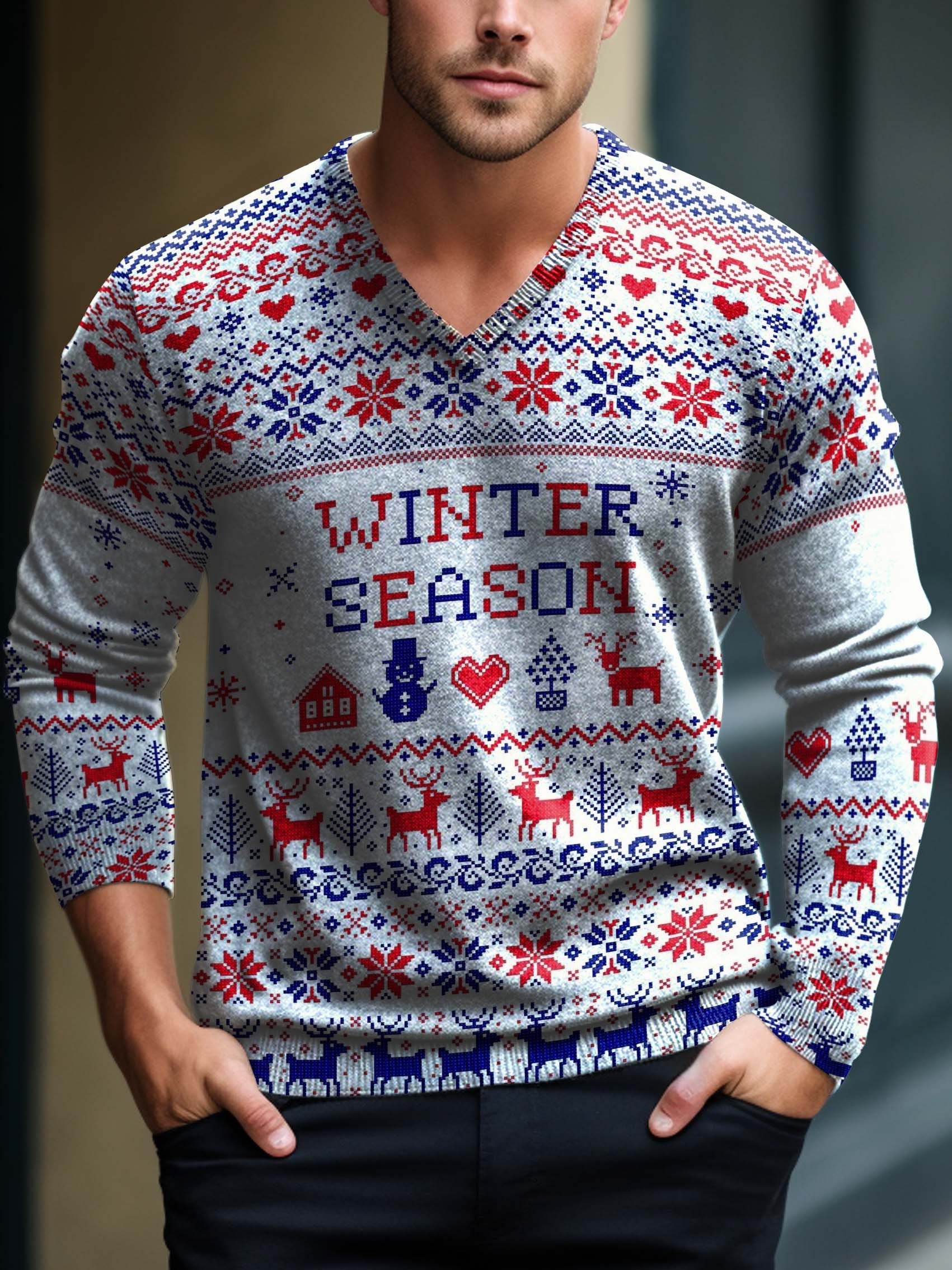Christmas Classic Pattern Decorative Pattern V-Neck Lnit Long Sleeve Sweater