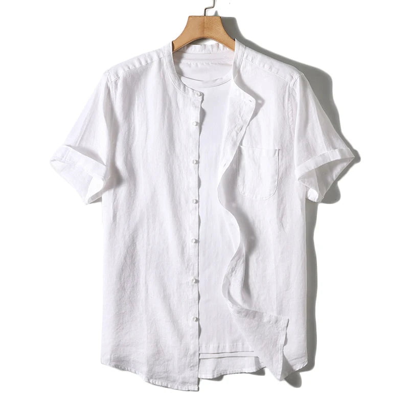 This pure linen shirt will elevate your summer wardrobe with its breathable fabric and convenient front pocket! Crafted from the finest linen, it offers unbeatable comfort and effortless style for any occasion. With its unique mandarin collar and rolled sleeves, add a touch of cool sophistication and make a stylish statement today!