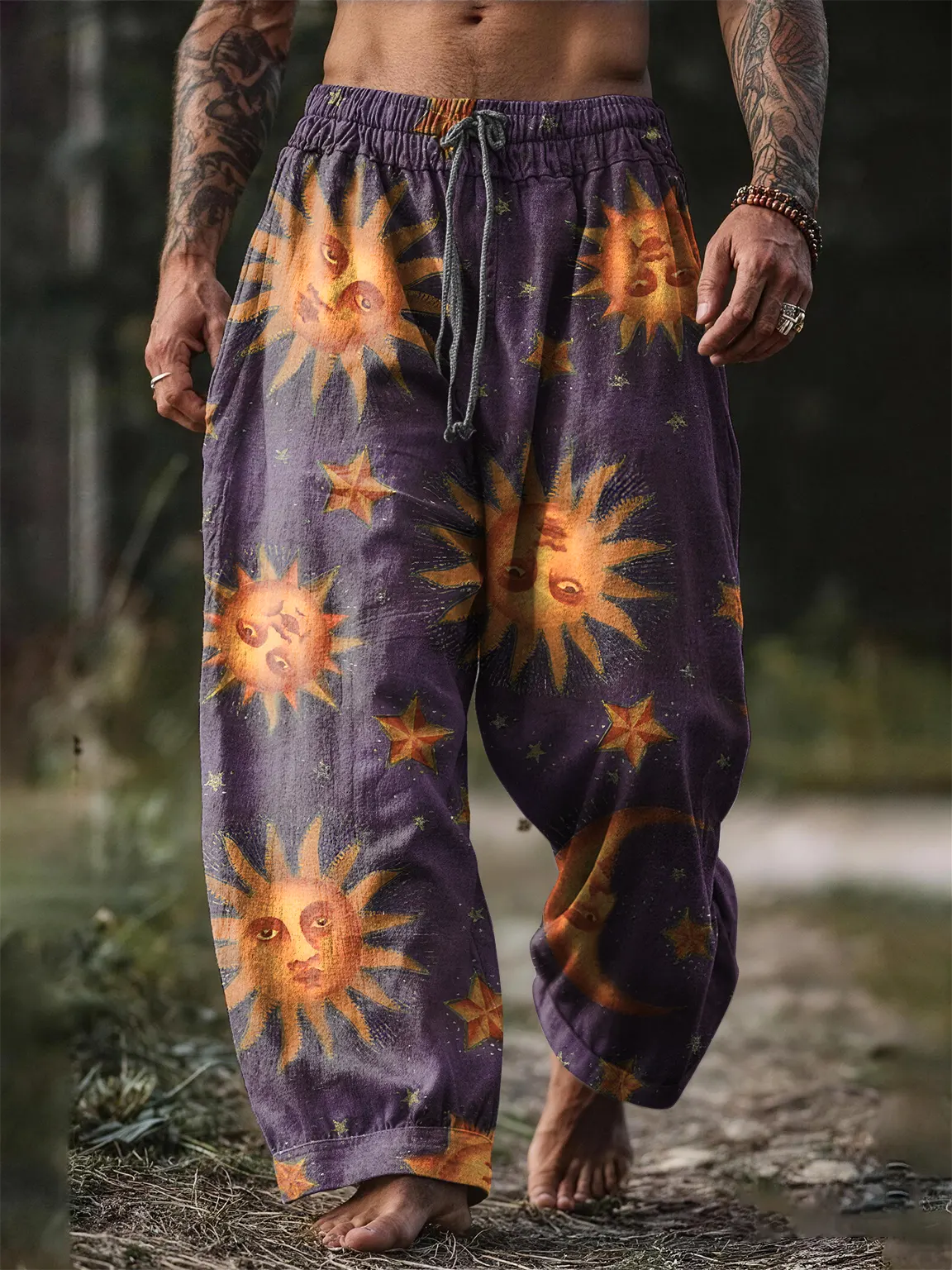 Men's Casual Retro Sun Art Print Cotton Pants