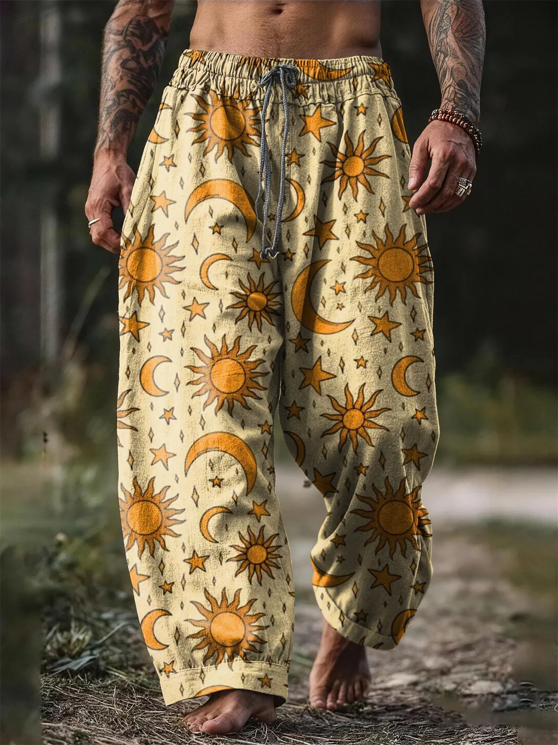 Men's Casual Retro Sun Moon Art Print Cotton Pants