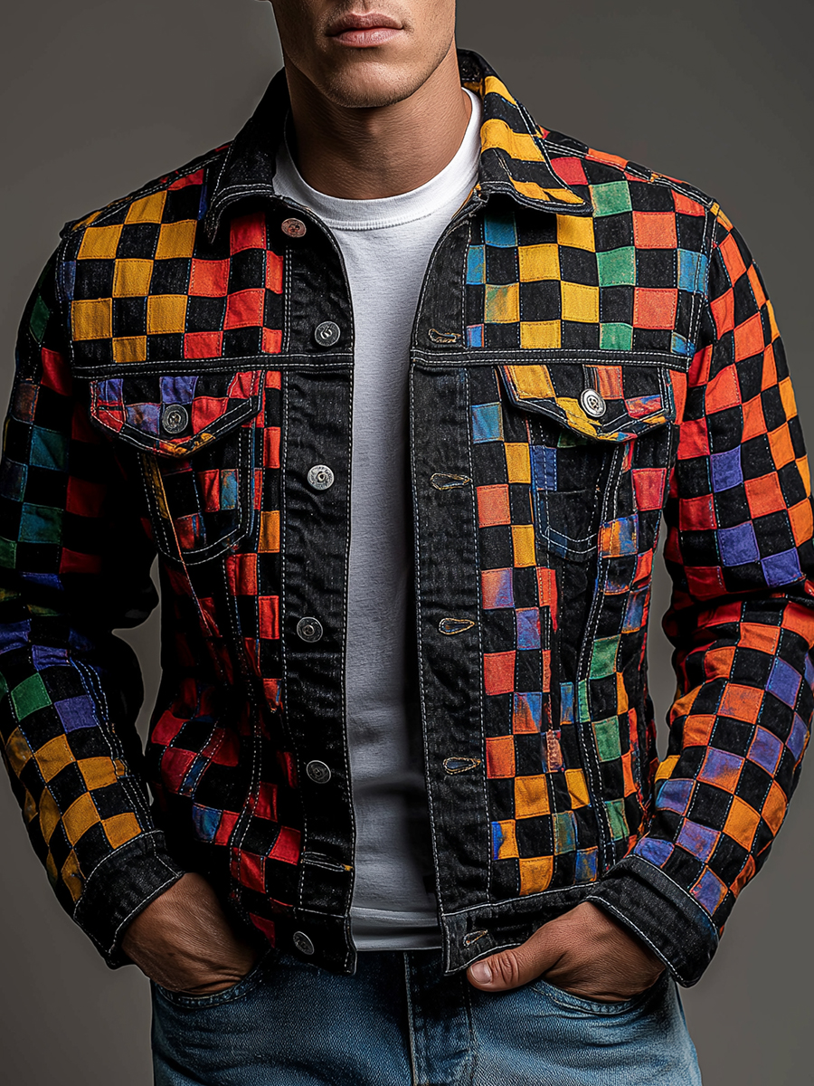 Vintage Colorful Checkerboard Print Denim Jacket